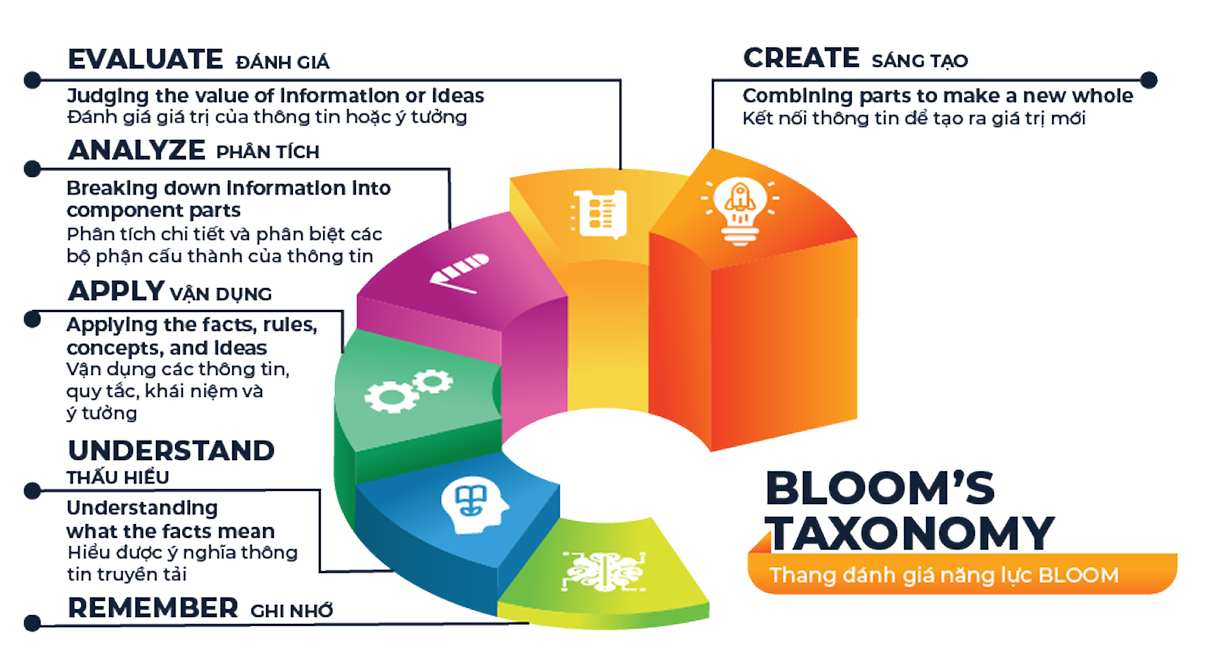 Thang đánh giá năng lực Bloom Taxonomy được áp dụng để Giáo viên, Học sinh INKINDY cùng đặt mục tiêu cho việc dạy và học, sau đó đo lường, đánh giá trong suốt quá trình triển khai và thực hiện. Thang Bloom giúp học sinh INKINDY vượt ra khỏi thang điểm 10 và nỗ lực đi đến bậc cao hơn đó là sự sáng tạo.